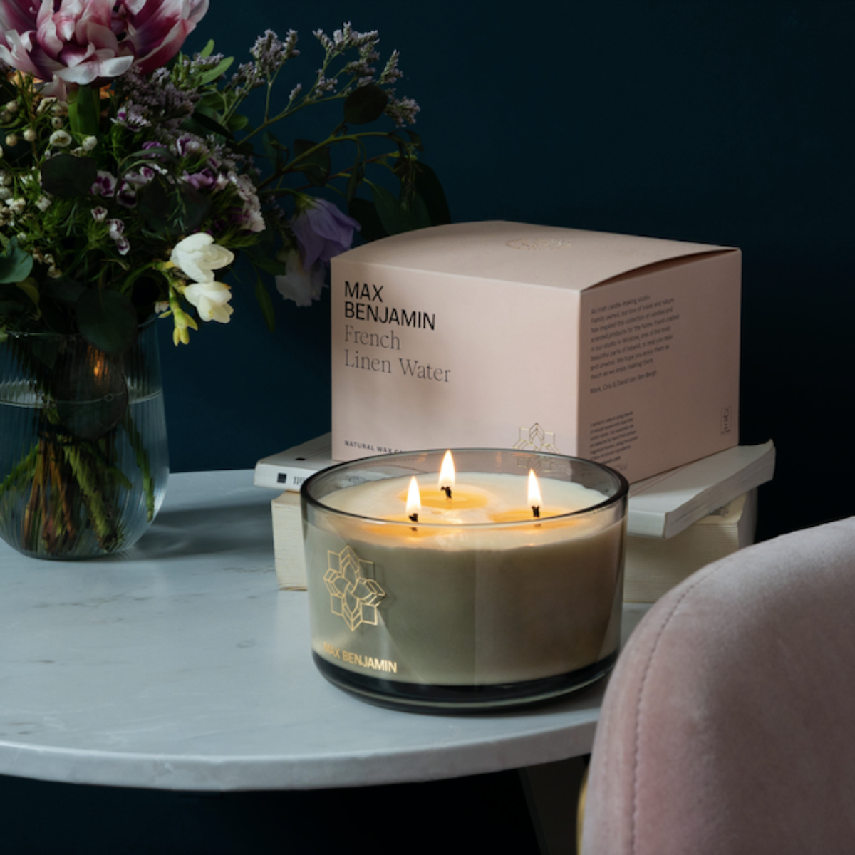 Vela de lujo de 3 mechas y tapa de lino francés, 560 gr