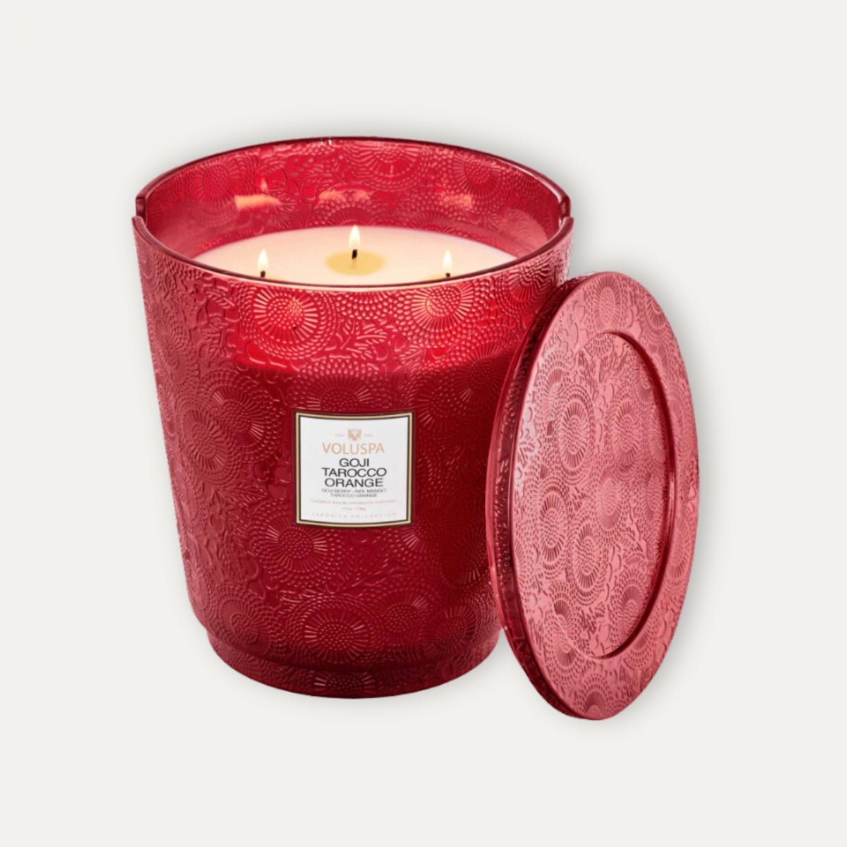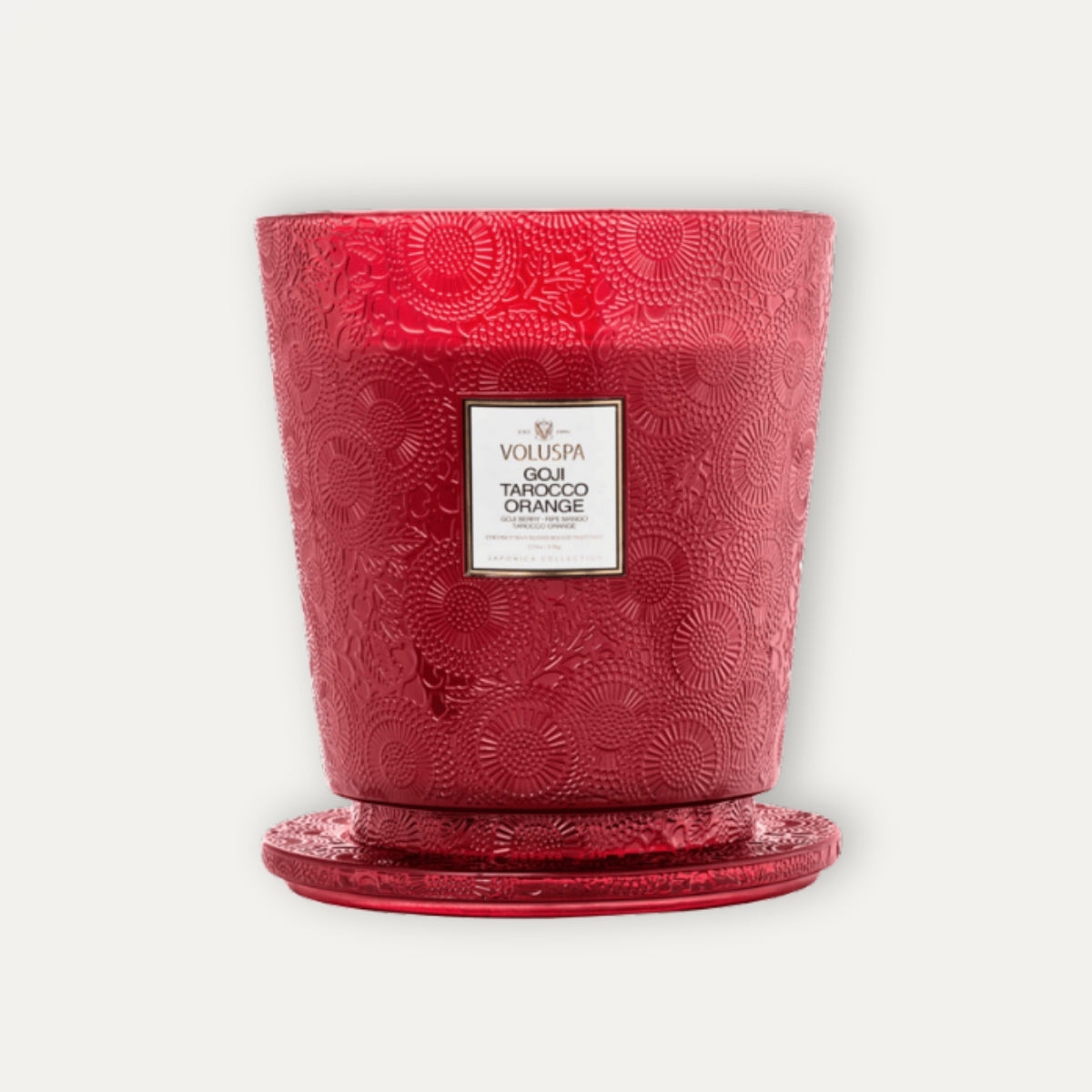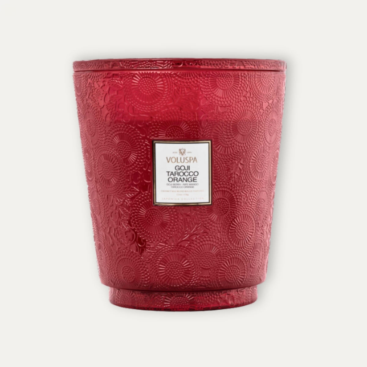 La mezcla única de cera de coco de Voluspa se vierte a mano en un recipiente de 123 oz / 3,5 kg. Recipiente de vidrio repujado y rematado con una tapa a juego que mantiene la vela libre de polvo cuando no está en uso. Sus cinco mechas te permiten disfrutar de la fragancia durante 250 horas. Estas velas se vierten a mano en los Estados Unidos y cuentan con una mezcla patentada de cera de coco de combustión limpia y mechas 100 % naturales. Los productos están libres de ftalatos, pesticidas, parabenos y sulfatos y nunca se prueban en animales.